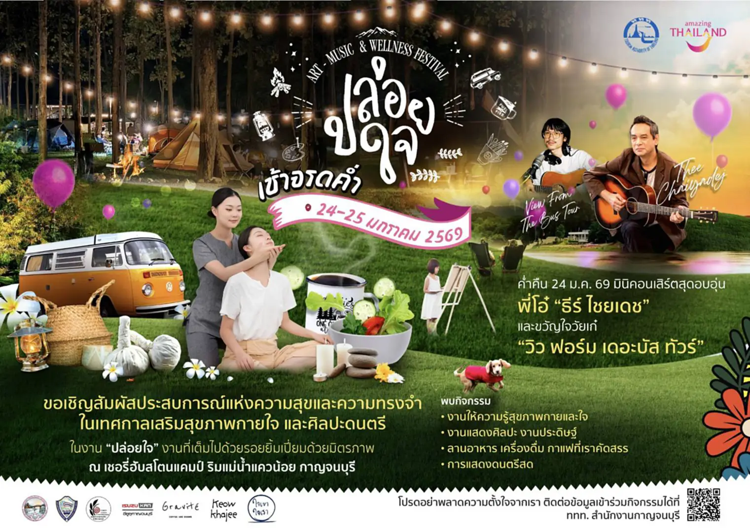 ปักหมุดวันปล่อยใจ ในวันเสาร์ที่ 24 มกราคม 2569 เวลา 09.00 – 23.00 น. และวันที่อาทิตย์ที่ 25 มกราคม 2569 เวลา 09.00 – 16.00 น. ณ เชอรี่ฮับสโตนแคมป์ ตำบลหนองหญ้า อำเภอเมือง จังหวัดกาญจนบุรี